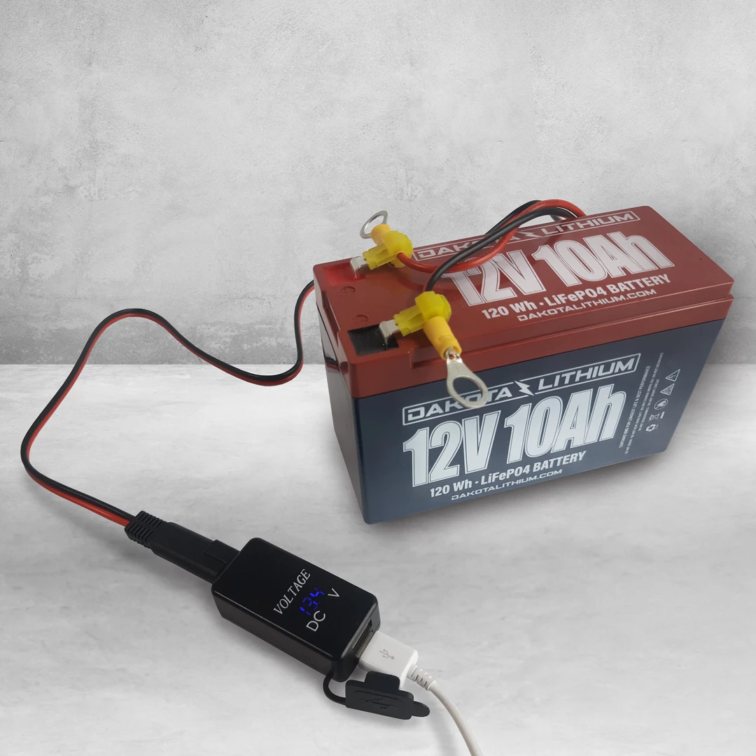 Use the ring terminals to attach to a 23Ah, 54Ah, or 100Ah Dakota Lithium battery. Charge your personal electronics via the USB charging ports, or remove the volt meter to connect to the SAE socket.