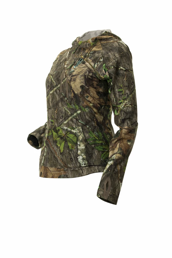 - Camo hunting shirt with attached hood and soft elastic binding