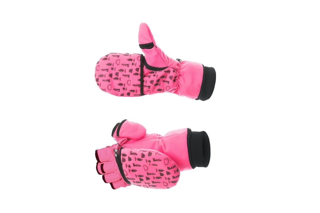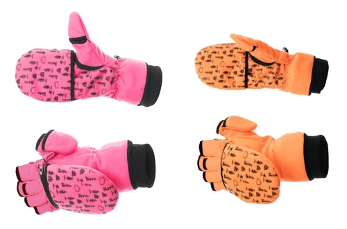 This flip top mitten, which converts from a mitten to a fingerless glove, features quiet brushed tricot windproof material in 3 color choices: Realtree Edge®, Blaze Orange, and Blaze Pink. It has a soft fleece cuff, silicone grip palm and a zip pocket on the back of the hand to add a heat packet or open of venting.
