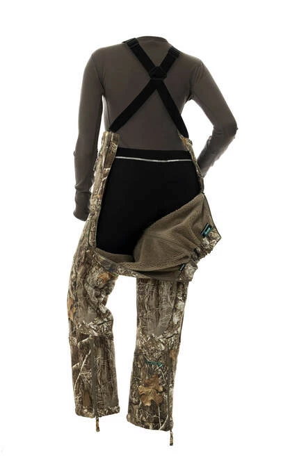 - Women’s camo hunting pants with suspenders and adjustable waist tabs