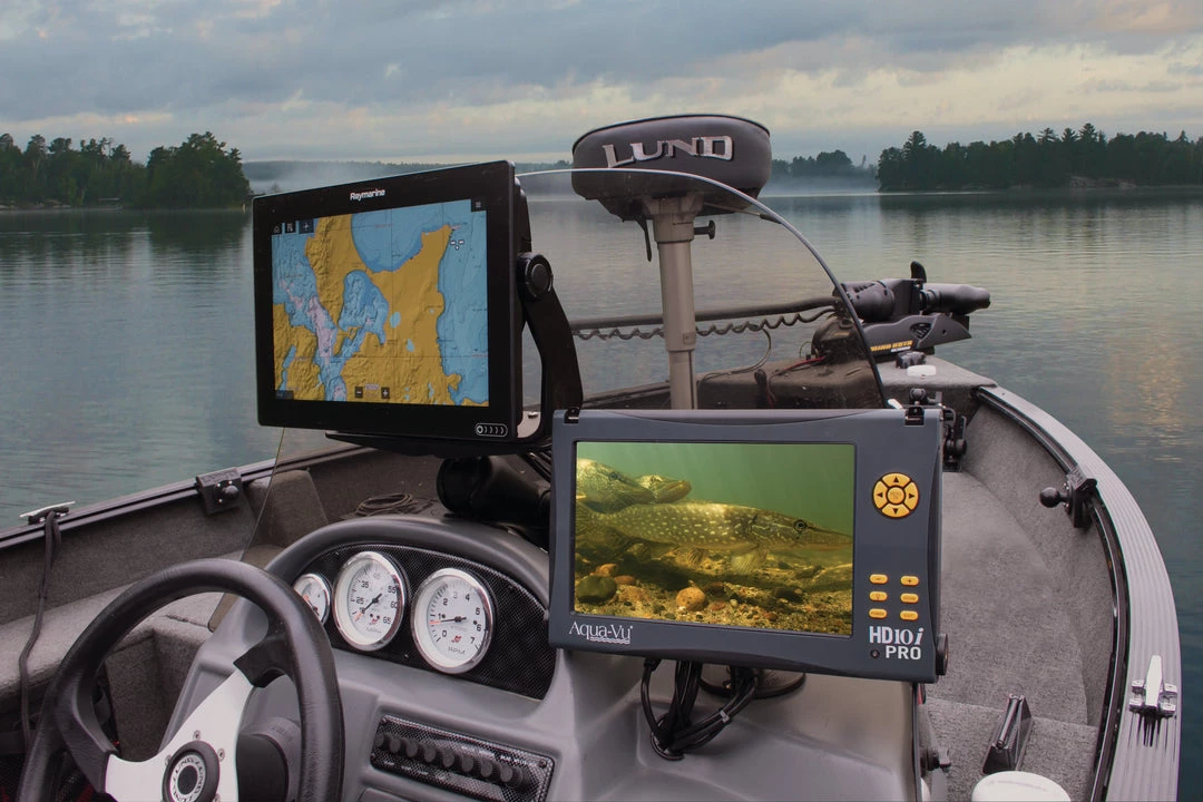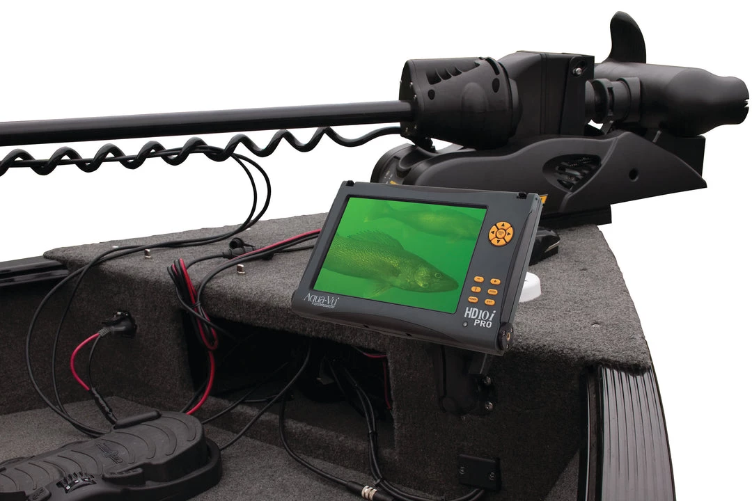 | FREE US SHIPPING-inquire for international postage! New HD10i Pro Gen2 upgrades include full 1080p HD resolution with image-clarifying True-Color technology & battery power saver mode. The most advanced HD underwater camera available today, the Aqua-Vu HD10i Pro equips serious underwater viewers with a dynamic, Super Bright, Daylight Viewable 10-inch LCD engineered with TouchZoom technology for putting big, elusive fish under the microscope. The HD10i Pro system utilizes Aqua-Vu’s modular XD Camera with Quick Attachment System™, plus real-time digital display of Camera Depth, Water Temperature and Direction with a full 125-feet of durable cable. |