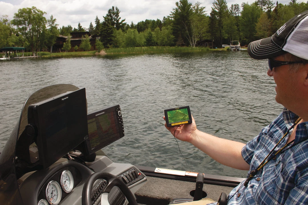 Put the whole underwater world in the palm of your hand. The Aqua-Vu micro Stealth 4.3 Underwater Viewing System provides crystal clear color video in a smartphone-sized package. Underwater viewing unit features a high-resolution 4.3-inch LCD and 50 feet of tough, abrasion-resistant camera cable and a thumb-sized micro underwater camera—wrapped on an integrated spool. Camera includes auto infrared lighting, and moves quietly through the underwater world with an included trolling fin and clip-on ballast weight. Also includes built-in lithium-ion battery and battery charger for 6 hours of continuous runtime.
