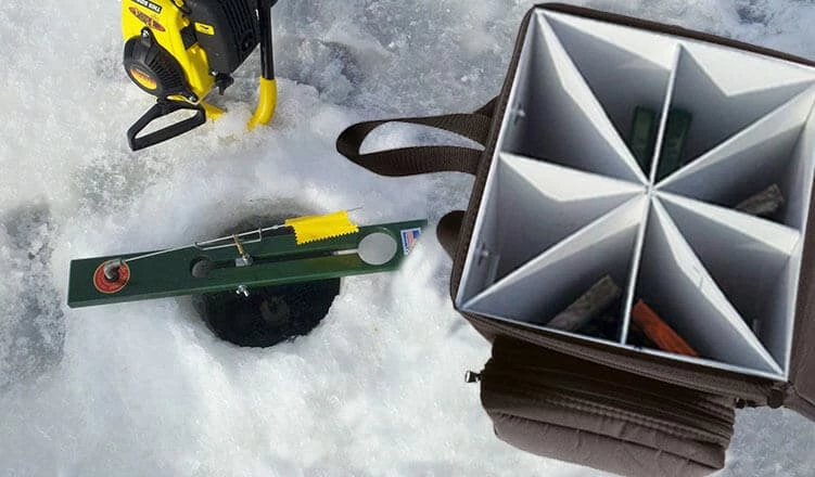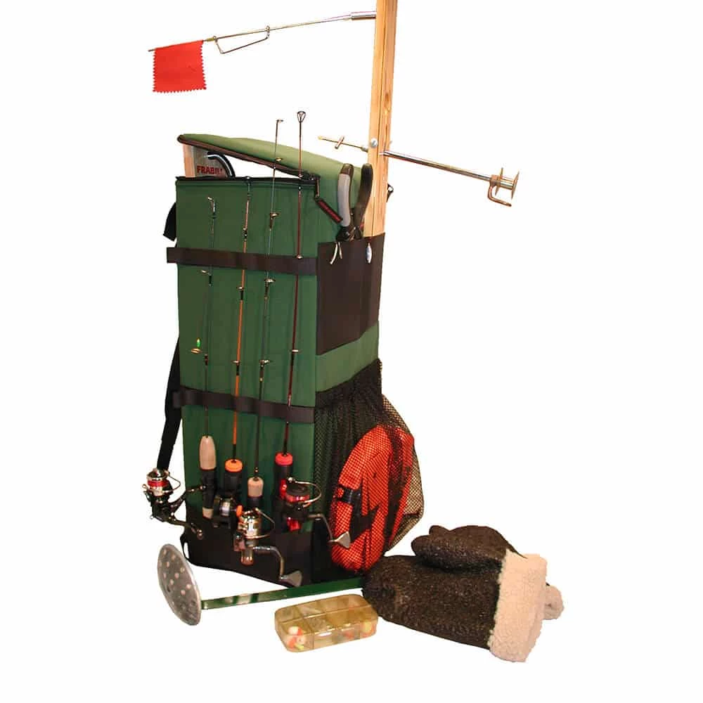 This Ice Pak accepts the largest tip-ups, along with gear pockets for tools, mesh pockets for round tip-ups and wet items, 2 large zippered pockets, and the bottom pocket with velcro that holds up to 5 rods on the side of this case – you can bring it all with you! Rugged ballistic bottom helps keep water out & prevent tears. Also includes an adjustable shoulder strap for easy carrying or as a backpack!