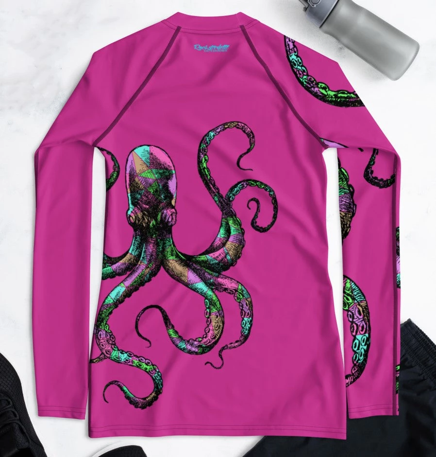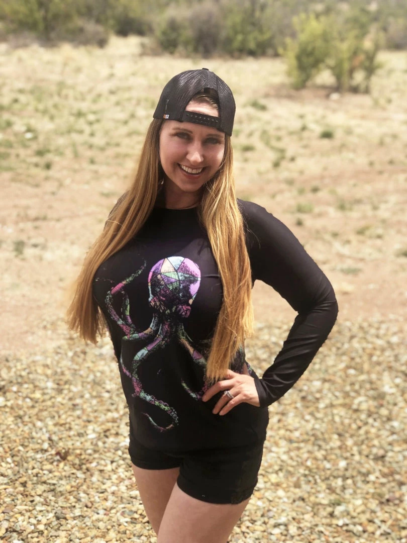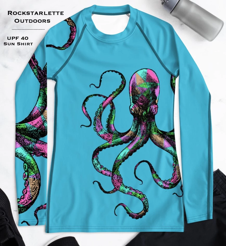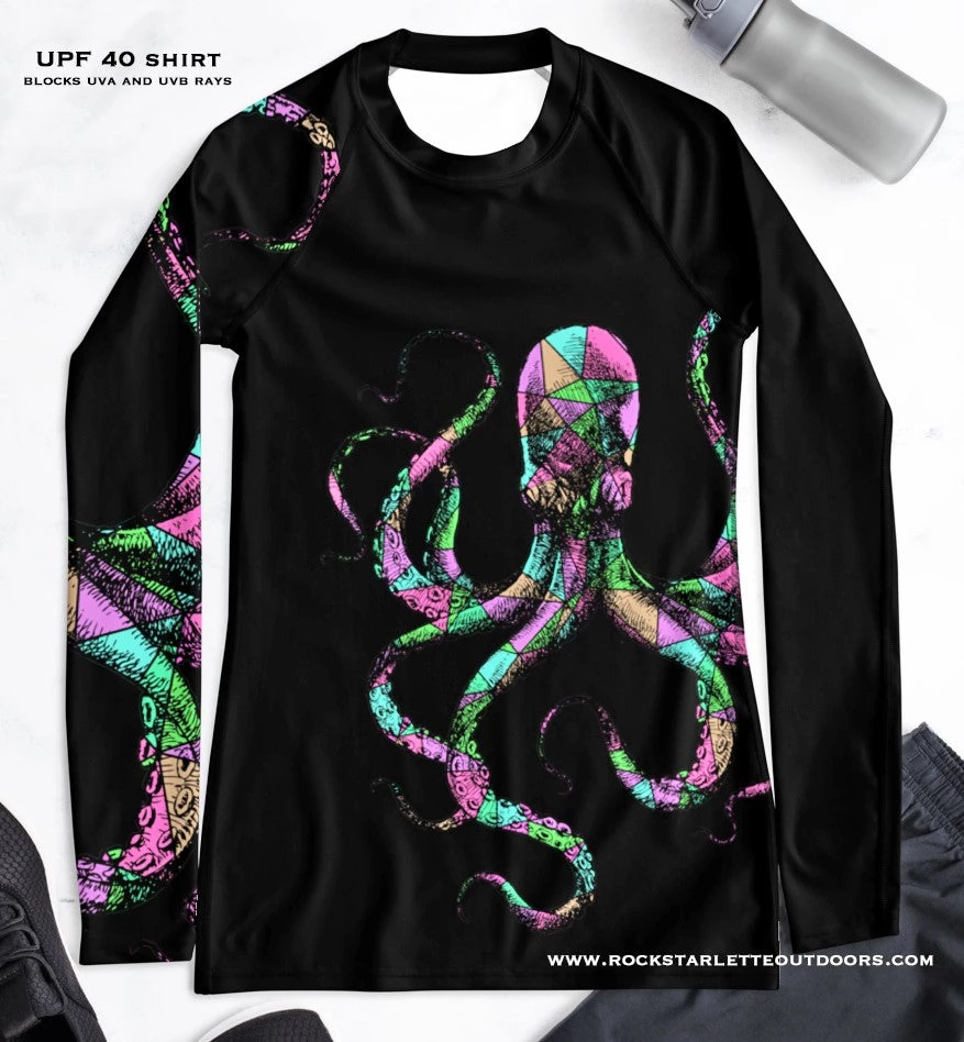 Rockstarlette Outdoors Octopus Logo Rash Guard Long Sleeve Sun Shirt! Perfect for swimming, fishing and hiking! 38-40 UPF (This shirt blocks both UVA and UVB rays). Made from our unique polyester / spandex, moisture wicking, quick dry fabric. Match with your Octopus Capri Leggings!