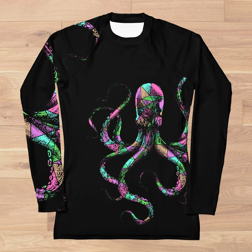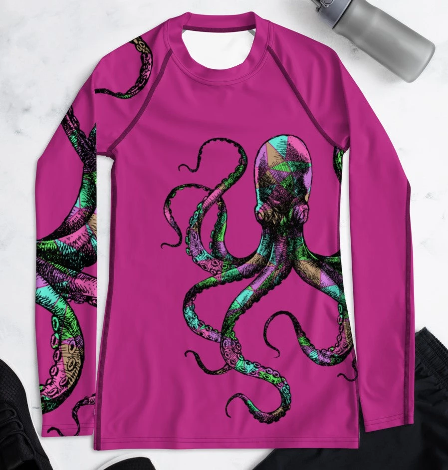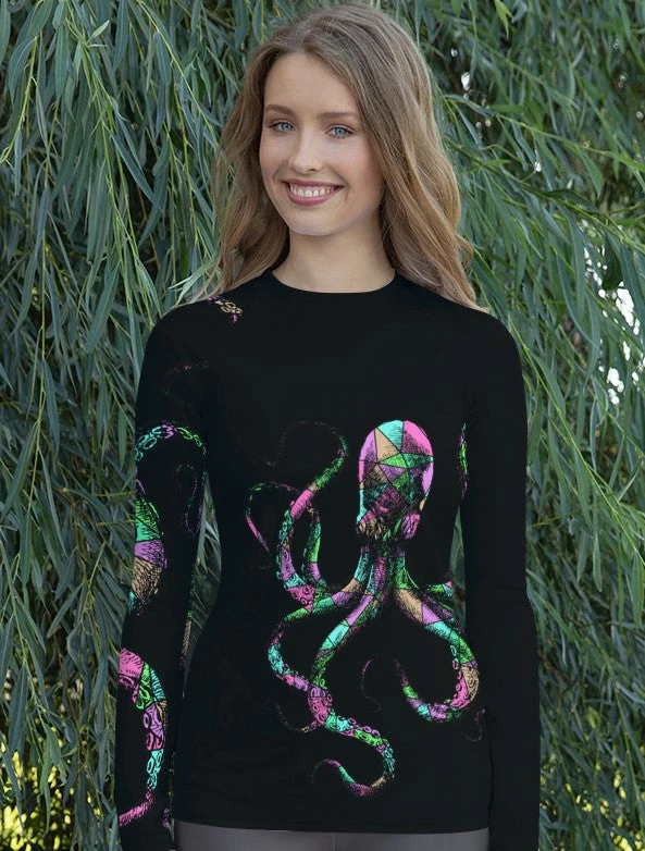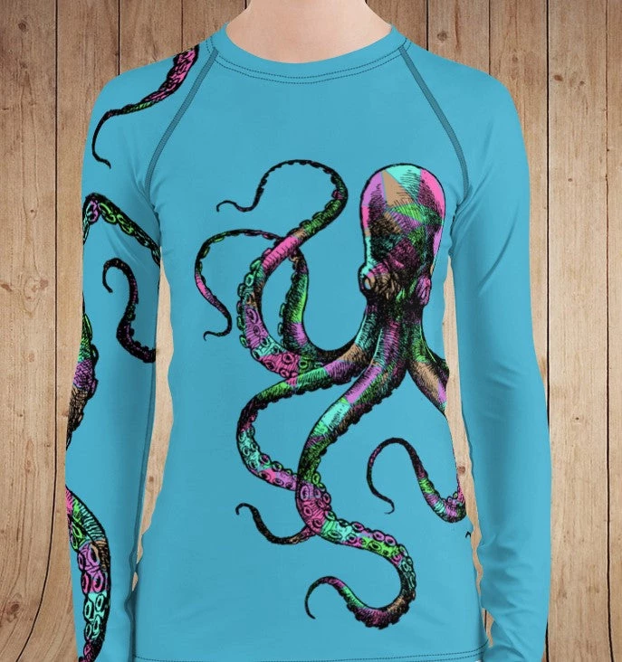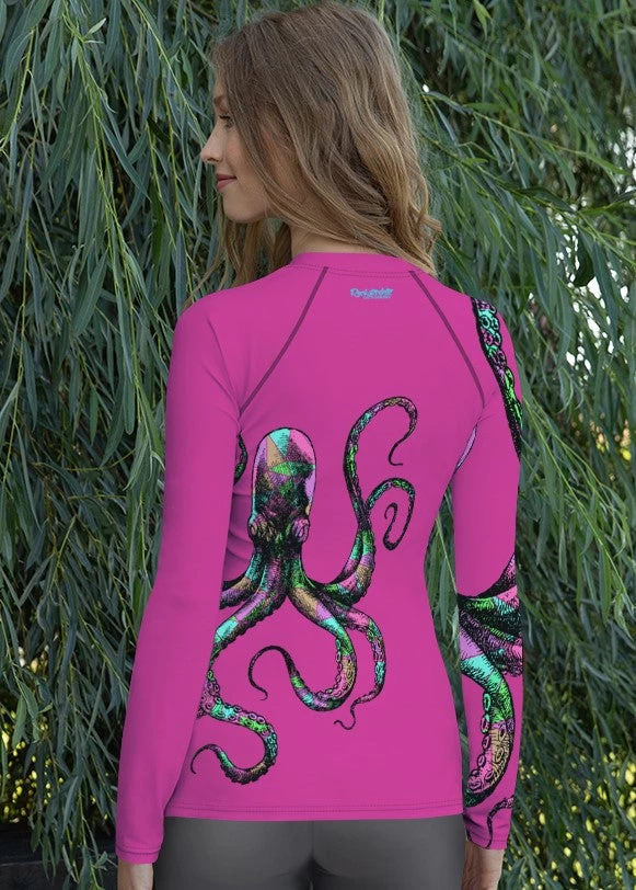 Rockstarlette Outdoors Octopus Logo Rash Guard Long Sleeve Sun Shirt! Perfect for swimming, fishing and hiking! 38-40 UPF (This shirt blocks both UVA and UVB rays). Made from our unique polyester / spandex, moisture wicking, quick dry fabric. Match with your Octopus Capri Leggings!